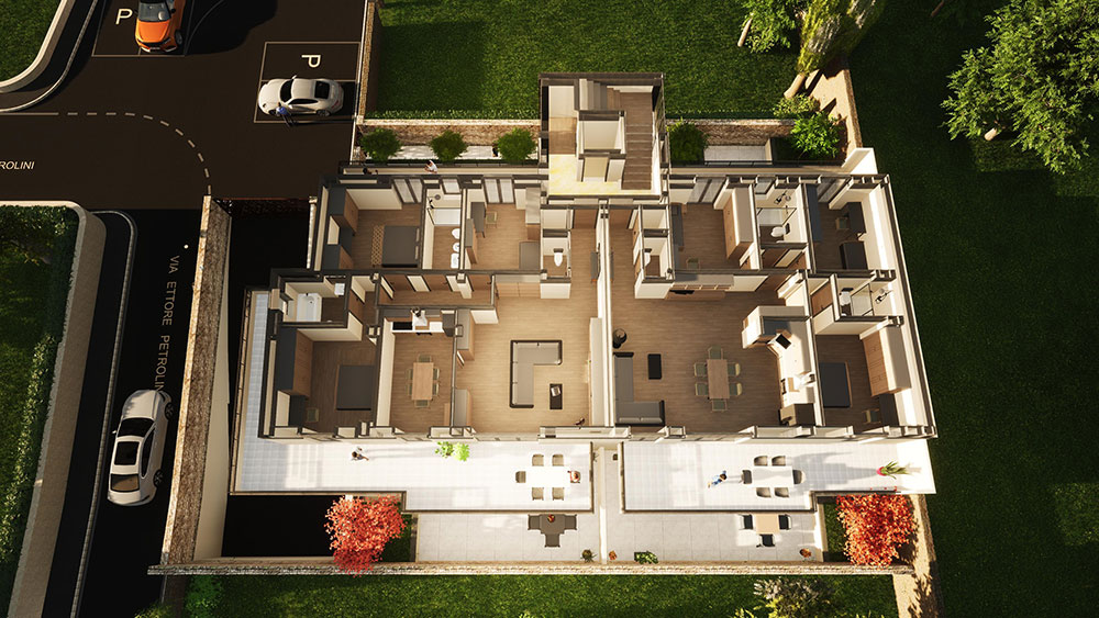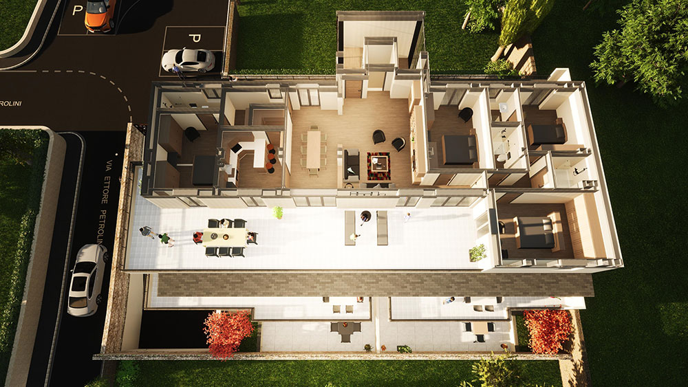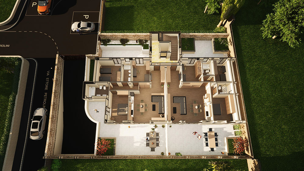 Nuova costruzione di una palazzina in classe “A”, composta da 5 unità abitative e 5 garage. L’immobile si sviluppa su quattro livelli con ascensore: garage interrato, piano terra, piano primo e piano secondo. Gli appartamenti sono dotati di grandi terrazze abitabili e resedi esterni. La nuova costruzione sarà edificata con materiali e impianti di ultima generazione, isolamento termo acustico, riscaldamento a pannelli radianti, climatizzazione e ventilazione meccanizzata, cappotto esterno all’edificio, infissi a taglio termico adeguato alla classe “A”.